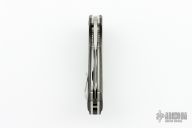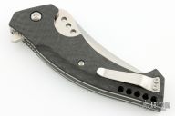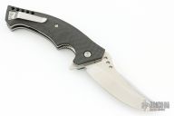 This custom flipper by Walter Brend is a Joel Pirela design, it features a two tone blade with satin finish flats and mirror polished grinds. Notches on blade spine and spine of handle. Carbon Fiber scales, titanium liners, carbon fiber backspacer, and a tip up titanium clip. Smooth function with a nice lock, detent and blade seating dead center. Hidden lanyard pin at the butt. Comes with original box, zippered case and papers. Excellent condition. Dated 05/14