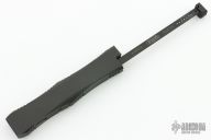This Nemesis III by Microtech Knives features a Walter Brend hand-ground hand rub satin finished double edged blade with fullers. The handle has a black aluminum frame with safety and charging handle. Dated 02/2000. Marked "W. Brend" on charging handle. Number 1383. Excellent condition. Comes with original box, sheath and papers. Excellent condition.
