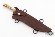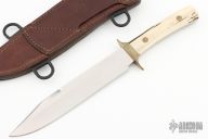 This Fighter by Jimmy Lile features a satin finished clip point blade with a false top edge, .191" blade thickness and 1.351" blade depth, full tang. The handle has a brass guard and stag scales with brass pins. "Hand Made by James B. Lile" on the the blade. Has a couple light scratches and couple couple of small pitting marks on the blade, no oxidation, otherwise excellent condition. Comes with a brown leather sheath, not original, but fits nicely.
