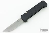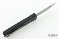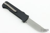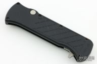 This OTF automatic by Rob Dalton features a bronzed and bead blast blade and black milled aluminum handle. Titanium clip. Fires via push button and retracts by holding the button and moving the slider on the side of the knife. Has light scratches and scuffs, otherwise great condition. F00160