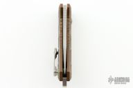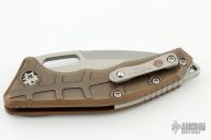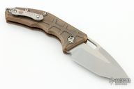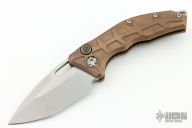 This Martyr by Heretic Knives features a stonewash finished tanto blade with false top edge, notched thumbrest, thumbhole and flipper. The handle has a copper frame, titanium hardware, liner, backspacer and tip up clip. Lighting strike carbon fiber inlaid into the push button. Comes with original box and drawstring bag. Excellent Condition.