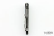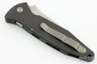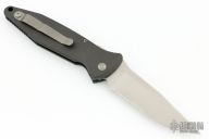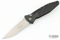 This Mini Socom Elite automatic folder by Microtech Knives has a green blade with a notched thumb ramp. The handle is comprised of black aluminum with non-slip inlays, stainless steel clip positioned for tip down carry, and lanyard hole at the pommel. Has saftey. Serial number #2997 and dated 03/2004. Comes with microtech nylon belt sheath and original box and papers. Excellent condition.