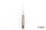 This Button Lock Auto ("9437" stamped on B-side ricasso) has a hand rub satin finished drop point blade with fileworked spine. Handle has wood scales with black liners, with satin finished stainless steel dovetailed bolsters, and filed auto/ lock button. Stainless steel backspacer is fileworked, including under spine. Nice blade seating, action and lockup. Has a couple light scratches, otherwise excellent condition.