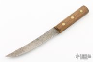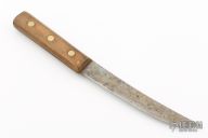 This Foster Bros Knife is made of carbon steel and has .097" blade stock and .889" blade depth, full tang construction. The handle has wood scales. Has some scratches and patina, has been used, etc, good condition for its age.
