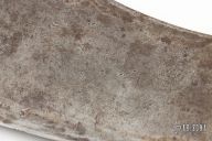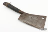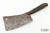 This antique early 1900s cleaver by Foster Bros features a forged blade with the traditional hole at the tip, .225" blade stock and 5.5" blade depth, full tapered tang construction. The handle has wood scales with cord wrap over them. Has been used, has scratches and patina, has been resharpened, otherwise good condition for its age.