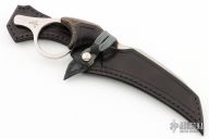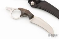 This Claw Neck Knife by Magnus Axelson features a hand rub satin finished hawkbill blade with fileworked spine, .143" blade stock and .825" blade depth, full tang construction. The handle has wood scales with brass liners. Comes with a black leather neck sheath. Excellent condition.