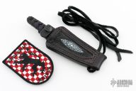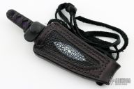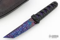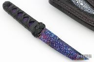 This Mini Tanto Neck Knife by Sam Eddleman features a blued Bertie Rietveld Dragonskin Damascus tanto blade with false top edge, .124" blade stock and .741" blade depth. Handle is wrapped in a traditional Japanese style using epoxy soaked nylon cord over rayskin. Knife is in excellent condition, shows no signs of use. Comes in a custom black leather neck sheath with stingray skin inlay.