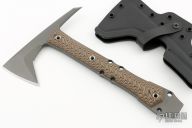 The Dvalinn is a full tang tomahawk made from .270" thick 1075 carbon steel, and features grippy 3D contoured G10 handle scales. The handle end features a small pry-bar, and there are holes provided in the handle that allow you to add paracord to the grip to "lock it in" to your hand for serious use. Think of this tool as your designer SKELETON KEY to wherever you wish to go. Pry, chop, fight, etc.