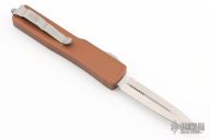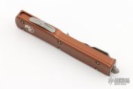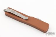 This UTX-70 OTF automatic by Microtech features a D/E satin finish blade with a standard edge. Aluminum handle with a stainless steel clip. Serial number 8822 and dated 11/2019. Excellent condition.