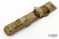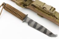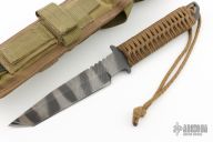 This Strider WB Fixed Blade has a tiger striped tanto blade with notched thumbrest, full tang construction, and .251" Blade Stock and 1.252" Blade Depth. Handle has tan paracord wrap. Has somes scratches, has been resharpened, otherwise good user condition. Comes with a Eagle USA nylon sheath.