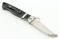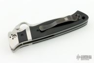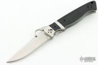 This Vallotton Sub-Hilt by Spyderco features a satin finished blade with a thumbhole, dual thumbstuds, and notched thumbrest. The handle has stainless steel bolsters, black G-10 scales, stainless steel liners, black G-10 backspacer, and 4-way reversible black stainless steel clip. Nice detent, lockup and blade seating.  Excellent condition.