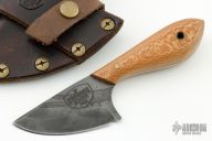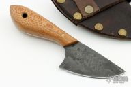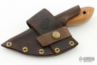 This knife by Crooked River Forge features a hand forged blade with visible temper line, .087" blade stock and 1.411" blade depth, full tang construction. The handle has lace wood scales with brass pins and lanyard hole. Comes with a brown leather sheath. Excellent condition.
