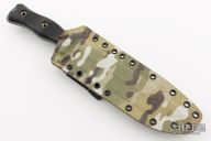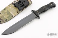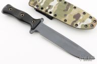 This Team Gemini Light Brigade by Busse Combat Knife Company features a drop point grey coated blade with fullers, .265" blade stock and 1.583" blade depth. The handle has black paper micarta scales over full tang construction. Exposed tang pommel with lanyard hole. Comes with a custom kydex sheath. Excellent condition.