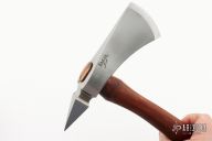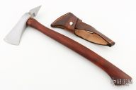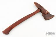 This Forged Spike Hawk by Journeyman Smith Stephan Fowler features a hand forged satin finished head made from 4140 carbon steel. Has a 16.75" hickory handle. Has a couple light scratches, otherwise excellent condition. Comes with a brown leather sheath.