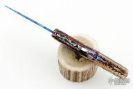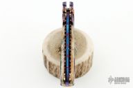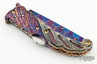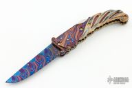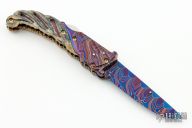 This knife by Suchat Jangtanong features a blued Mosaic Damascus blade with a single gold Dellana dot. The handle has carved blued mosaic Damascus bolsters with diamond insets, carved mammoth ivory scales, fileworked and anodized titanium liners and a fileworked stainless steel backspacer with a diamond inset, gold plated screws. Comes with zippered case. Nice lockup and blade seating. Very impressive work. Excellent condition.