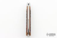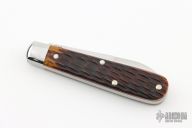This knife by Great Eastern Cutlery features a satin finished drop point blade with a single long pull nail nick. The handle has steel bolsters and gold jig bone covers over steel liners.  Includes the original packaging.  Excellent Condition.