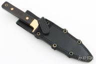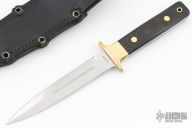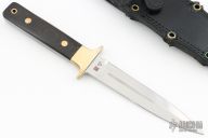This Fang 2 by Al Mar Knives features a mirror polished blade with fuller and double edged, .145" blade stock and .933" blade depth, full tang construction. The handle has brass bolsters, black/brown paper micarta scales with brass pins and lanyard hole. Comes with original box and black leather sheath. Excellent condition.