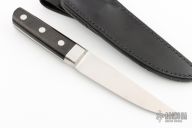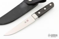 This is a vintage Al Mar Model 4003 has laminated wood scales, integral bolster and full tang construction. Satin finished blade with .126" blade stock and 1.119" blade depth. Comes with black leather sheath and original box. Excellent condition.
