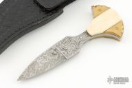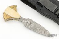 This push dagger features a Damascus blade with .175" blade stock and .942" blade depth, full tang construction. The handle has fileworked brass scales with bone inlays. comes with a hand tooled black leather sheath. Has some light scratches, otherwise excellent condition.