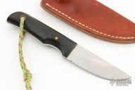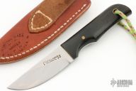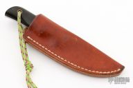 This Model 10 Salt Fisherman and Household Utility features a satin finished upswept blade with swedge and notched thumbrest, .118" blade stock and .860" blade depth. The handle has red linen micarta scales with brass pins over full tang construction. Brass lanyard tube with lanyard in pommel. Includes a brown leather sheath. Has some light scratches, has been resharpened, otherwise good condition.