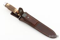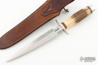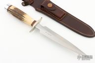 This Model 2-8 by Randall Made Knives features a double edged satin finished blade with .208" blade thickness and 1.151" blade depth, hidden tang construction. Has the small Randall logo. The Model 2 is a heavily made dagger or dirk. Nickel silver guard, stag handle, duralumin butt cap with brass washer and steel tang nut. HH Heiser brown button rough back sheath. Comes with a zippered case. Has some scratches and patina excellent condition otherwise.