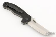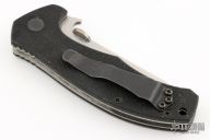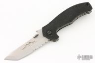 This Mini Roadhouse by Emerson has a stonewashed tanto blade with a partially serrated edge, custom titanium thumbdisc and wave feature. #551 on blade, dated 2014. The handle has black G-10 scales, titanium liners and a tip up clip. Nice detent, lockup and blade seating. Comes with original box and papers. Has some scratches, otherwise good condition.