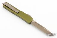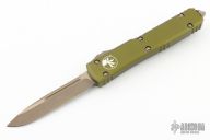 This Ultratech OTF automatic features a bronzed Apocalyptic drop point blade with a standard edge and a black anodized aluminum handle. Matching stainless steel clip, titanium hardware, and glass breaker. Serial number 274137 and dated 03/2023. Comes with original box and papers. Excellent condition.