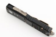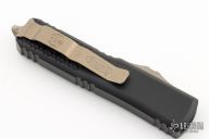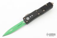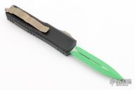 This UTX-85 OTF Automatic from Microtech features a green cerakoted double-edged blade with fuller. The handle has a black aluminum tri grip frame with bronzed steel thumb slide, clip and glass breaker. Dated 04/2023 with a S/N of 6225. Comes with original box and papers. Excellent condition.