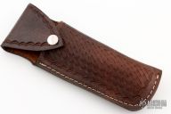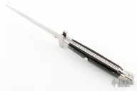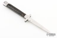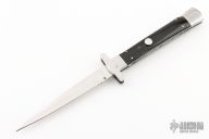 This Auto by Agasi Hambartsumian of Armenian Doctor Knives features a mirror polished blade. The handle has stainless steel bolsters and liners, buffalo horn scales with brass pins, fileworked stainless steel backspacer. New from maker. Comes with a hand tooled brown leather sheath.