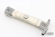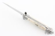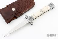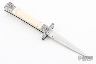 This Auto by Agasi Hambartsumian of Armenian Doctor Knives features a satin polished blade. The handle has engraved stainless steel bolsters, stainless steel liners, white bone scales with brass pins, fileworked stainless steel backspacer. New from maker. Comes with a brown leather sheath.
