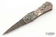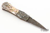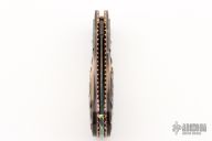 This knife by Suchat Jangtanong features a Damascus blade with false top edge and nail nick. The handle has carved 416 SS bolsters with a ruby inlay, carved black lip pearl scales with sapphire inlays, fileworked and anodized titanium liners and backspacer with diamond inset, gold plated screws. Comes with zippered case. Nice lockup and blade seating. Very impressive work. Excellent condition.