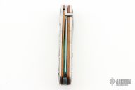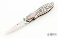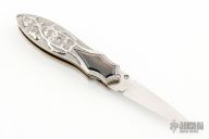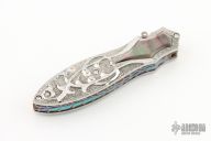 This knife by Suchat Jangtanong features a mirror polished blade with false top edge and a single thumbstud with a diamond inset. The handle has carved 416 stainless steel scales with black lip pearl inlays and gold pin inlays, fileworked and anodized titanium liners and backspacer. Comes with zippered case and COA dated Jan 01, 2013. Nice detent, lockup and blade seating. Very impressive work. Excellent condition.