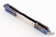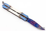 This Balisong by Suchat Custom Knives features a blued Robert Calcinore Mosaic Damascus blade with false top edge. The handle has stippled carved and anodized titanium bolsters, fileworked and anodized titanium liners, carved mammoth ivory scales, mosaic Damascus latch with sapphire insets. Has spring latch. Flips nice and smooth. Excellent condition. Comes with a zippered case and COA dated August 1, 2015.