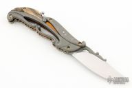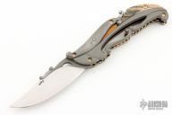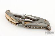 This knife by Suchat Jangtanong features a satin finished blade with carved ricasso. The handle has carved Damacus and 416 SS scales with mammoth ivory at the butt, fileworked and anodized titanium liners and fileworked stainless steel backspacer with diamond inset, gold plated screws. Comes with zippered case. Nice lockup and blade seating. Very impressive work. Has some scuffs and a darkened spot on the damascus bolsters, otherwise excellent condition.