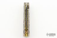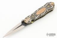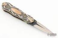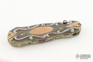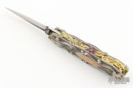 This knife by Suchat Jangtanong features a satin finished blade with false top edge and a single thumbstud with a diamond inset, engraved ricasso. The handle has carved 416 stainless steel scales with mokume and mammoth ivory inlays, fileworked and anodized titanium liners and backspacer with diamond inset. Comes with zippered case and COA dated Feb 18, 2013. Nice detent, lockup and blade seating. Very impressive work. Excellent condition.