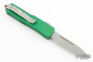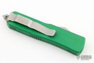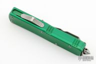 This Daytona OTF automatic by Microtech features a bead blasted blade with a standard edge, and a green handle with blasted hardware and glass breaker. Marked "USN 2011" on blade. Excellent condition. Comes with a zippered case.