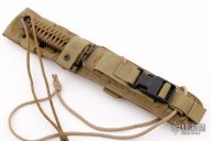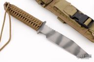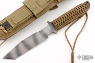 This BT Fixed Blade from Strider Knives features a tiger striped clip point tanto style blade with notched thumbrest, .251" blade stock and 1.293" blade depth. The handle has paracord wrap over full tang construction with a lanyard hole. Includes an Eagle Brand nylon sheath with belt loop. Has a couple light scuffs and some light oxidation, otherwise good condition.