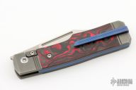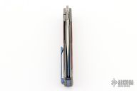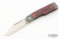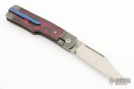 This Gunslinger Jack is a gunstock front flipper model by Jack Wolf Knives featuring a satin finished clip point blade with fuller. The handle has integral bead blast finish pinched and fluted titanium front and rear bolsters and liners, CamoCarbon inlays, anodize finish backspacer, and titanium tip up clip. Has filler tab for clip. Comes with box, metallic tube with Sean Tiffany artwork, sticker, pog, and microfiber cleaning cloth. Has a couple scratches, otherwise excellent condition.