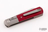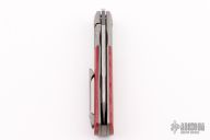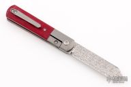 This Barlow Front Flipper by Enrique Pena features a Damascus blade with a front flipper and notched thumbrest. The handle has titanium bolsters, red canvas micarta scales with a titanium backspacer and matching tip up pocket clip. Includes the original box.  Has a few scuffs, otherwise excellent condition.