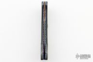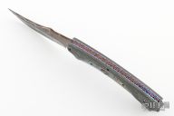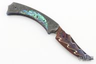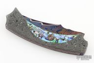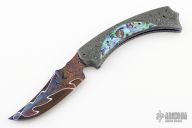 This Tribute Prototype by Brandon Vallotton features a Baker Forge, "Tsunami" Copper-Mai blade.  The handle has Nichols Damascus and Abalone scales over anodized/anodized titanium liners.  Fileworked steel backspring.  Includes a padded zippered case and COA.  Excellent Condition.