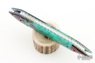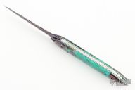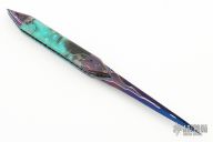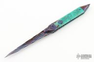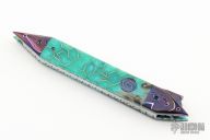 This knife by Brandon Vallotton features a Baker Forge, "Tsunami" Copper-Mai blade.  The handle has Copper-Mai bolsters, Voodoo Resins scales over fileworked titanium liners.  Fileworked steel backspring.  Includes a padded zippered case and COA.  New from Maker!