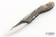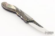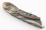 This knife by Suchat Jangtanong features a mirror polished blade with carved ricasso, single thumbstud with diamond inset. The handle has carved 416 SS bolsters, black lip pearl scales, carved Chad Nichols Damascus overlay, fileworked and anodized titanium liners and a fileworked stainless steel steel backspacer with diamond insets, gold plated screws. Comes with zippered case and COA dated Feb 18, 2013. Nice lockup and blade seating. Very impressive work. Excellent condition.