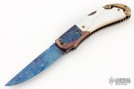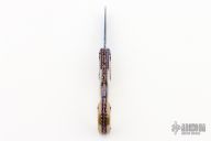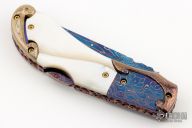This knife by Suchat Jangtanong features a Chad Nichols blued Damascus blade with fileworked spine and a single gold Dellana dot. The handle has carved and blued Chad Nichols Damascus bolsters, carved mother of pearl scales, carved mokume rear bolsters, fileworked and anodized titanium liners and a fileworked blued Damascus backspacer with ruby insets, gold plated screws. Comes with zippered case and COA dated Jan 05, 2016. Nice lockup and blade seating. Very impressive work. Excellent condition.