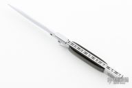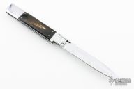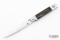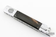 This Picklock Auto by Agasi Hambartsumian of Armenian Doctor Knives features a mirror polished bayonet ground blade with a false top edge. The handle has a polished stainless steel frame with fileworked stainless steel backspacer, buffalo horn scales with brass pins. New from maker.