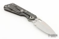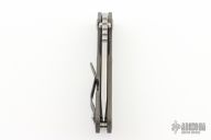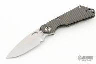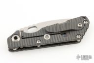 This Mick Strider Performance Series SMF framelock folder features a hand ground stonewashed drop point blade with thumbhole and notched thumbrest. The handle has a flamed titanium frame with titanium clip, tip up carry. Jimping on blade spine. Includes Hinderer "Lock Bar Stabilizer" for maximum reverse lock retention. Nice detent, lockup and blade seating. New Condition.