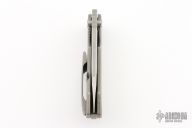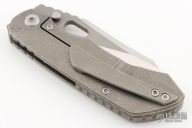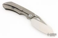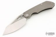 This Evolution 3.0 by Custom Knife Factory features a satin finished blade with notched thumbrest and thumbhole. The handle has a stonewashed bark finished titanium frame with a backspace with a matching tip up pocket clip. Comes with velcro case, extra hardware, and COA. Nice detent, lockup and blade seating.  #577.  Excellent condition.