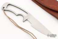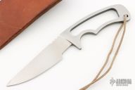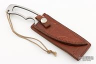 This knife by Bowen USA features a satin finished blade with notched thumbrest, .220" blade stock and 1.078" blade depth, full integral construction. Comes with original brown leather sheath. Has a couple light scratches, otherwise excellent condition.