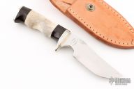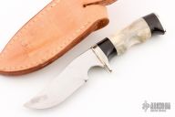 This knife by Wallace Landrum features a mirror polished blade with notched thumbrest, .154" blade stock and 1.154" blade depth, hidden tang construction. The handle has a nickel silver guard and butt, stag grip and black/wood spacers. Comes with a brown leather sheath, but the keeper is missing the snap. Has some light patina, otherwise good  condition.