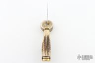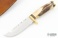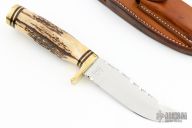 This Skinner by Roland Leroy "BUZZ" Travelbee features a mirror polished blade with fileworked spine and a false top edge, .126" blade stock and 1.138" blade depth, hidden tang construction. The handle has a brass guard and butt, stag grip with black/red/brass spacers. Coems with a brown leather sheath. Excellent condition.