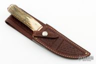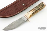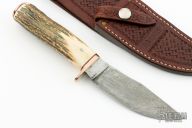 This knife by Chuck Hawes features a Damascus blade with notched thumbrest and fileworked spine, .196" blade stock and 1.295" blade depth, hidden tang construction. The handle has a mokume guard and butt, stag grip with red spacers. Comes with a hand tooled brown leather sheath. Blade is mareked "Bowie Corp 2001". Has some light scratches, otherwise excellent condition.